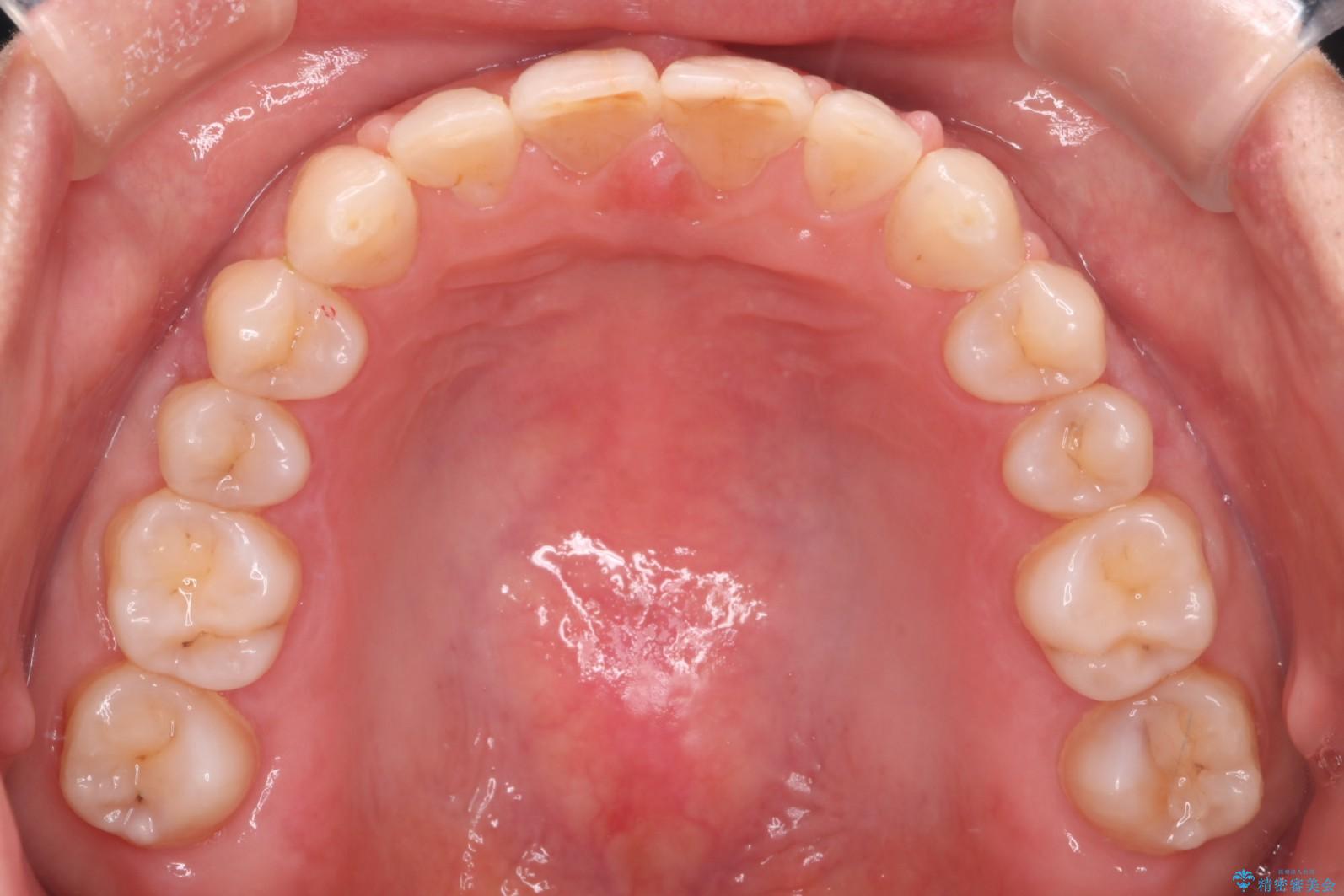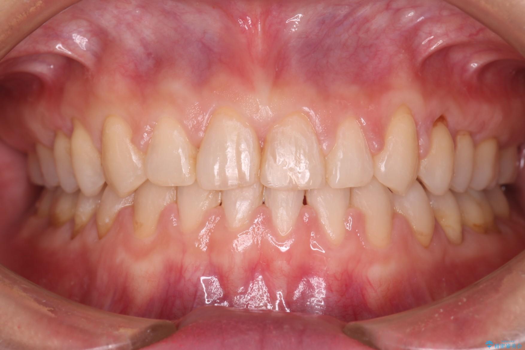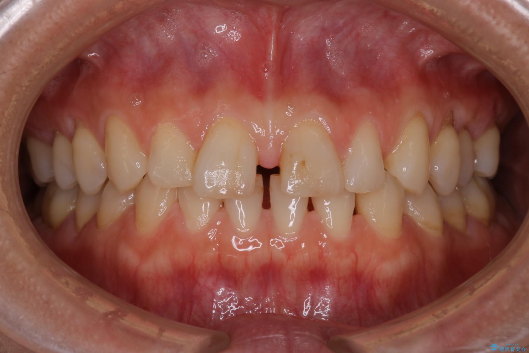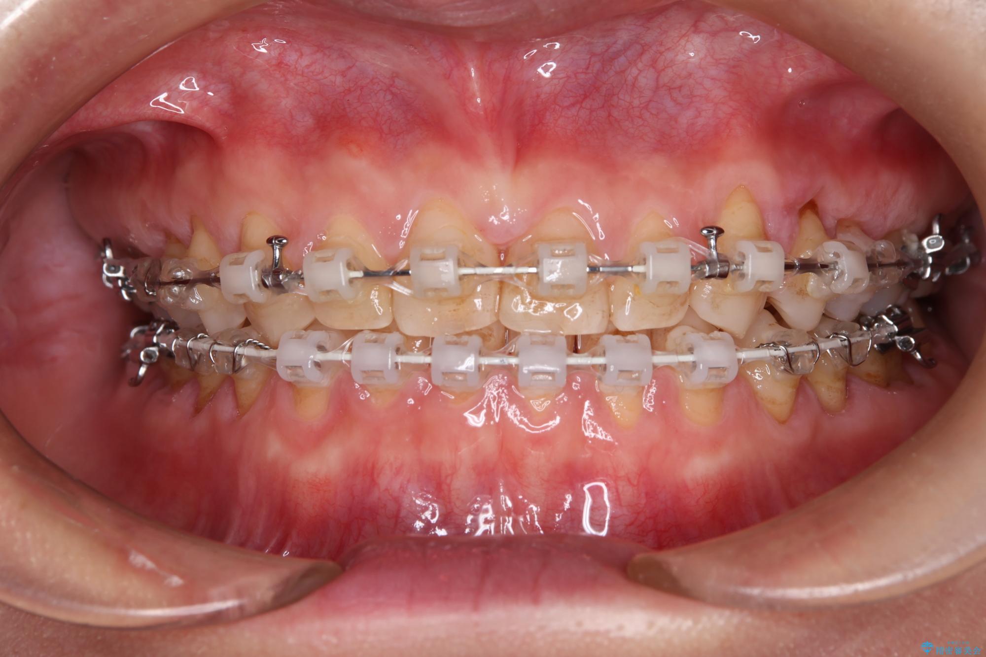 前歯の隙間を閉じるために上下でゴム掛けを行い、治療は良好に進みました。しかし、一時的に歯磨きが不十分だったことによる歯ぐきの腫れがあり、その部分のスペースを閉じるのに少し時間がかかりました。